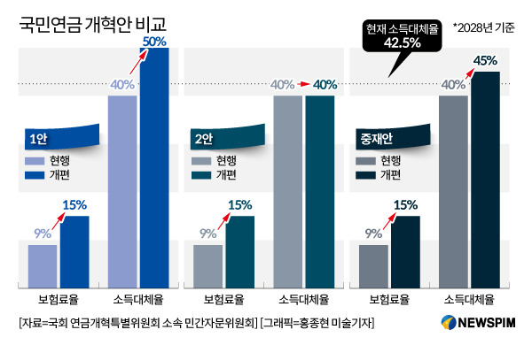 과 같은 그래프를 통해 국민연금 개혁안의 제안된 변화를 확인할 수 있어요.